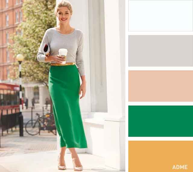 Серый цвет — не значит скучный. Он является идеальной основой для офисного стиля, но мы не советуем носить его с ног до головы. Лучше отдайте предпочтение комбинации серого и зеленого. Серый цвет сочетается с любым оттенком зеленого: от мятного до оливкового.