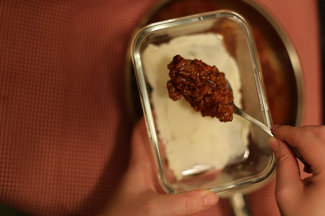 Потом – слой мясного соуса.