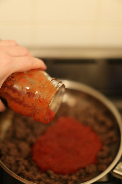 Готовый томатный соус в банке (итальянские соусы для пасты), который нужно довести до совершенства добавлением моркови, ложки вина, сахара и гранулированного чеснока. Можно также приготовить соус самостоятельно – из консервированных томатов без кожицы или натертых (взбитых в блендере), очищенных от кожицы томатов.