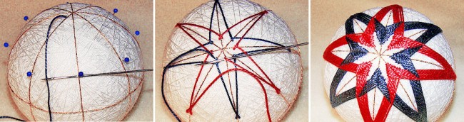 Знаючи полюси і місце розташування екватора нашого темарі, розділіть його на сектори. Акуратно надріжте паперову смужку у Північного полюса, звільніть її від шпильки, при цьому саму шпильку у жодному не виймаєте! Таким чином, зараз на смужці чотири позначки – полюси і дві позначки екватора. Чіпляєте смужку паперу за одну зі шпильок екватора. Тепер, якщо ви обведе нею кульку і поставите шпильки в місцях відміток, у вас з’явиться ще дві нові шпильки екватора, і їх тепер стане чотири. Тобто всього у нас вийшло 6 шпильок, і 6 відміток. Далі «накресліть» розмітку нитками, щоб було зрозуміло, за чим далі вишивати. Заправляєте нитку в голку і на кінці зав’язуєте вузлик. Встромляємо голку в деякому віддаленні від Північного полюса так, щоб вона вийшла точно в точці Північного полюса. Обережно, але впевнено тягнете за ниточку – вузлик сховається під обмоткою і стане невидимий.