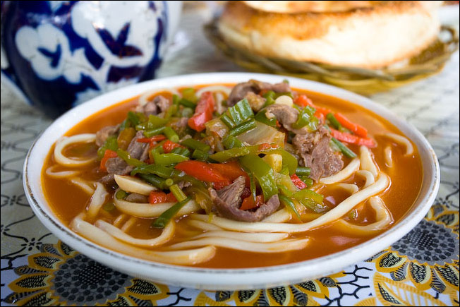 Лагман – одно из самых любимых блюд жителей Средней Азии. Оно состоит из основной (мясоовощной части) и специальной лапши. Благодаря последней узбеки называют это блюдо чузма-лагмон – от узбекского «тянуть». Лагман по особой технологии, вытаскивая в холодной воде. При особом мастерстве повара «чузма» может достигать даже 5 метров в длину. Если готовить лагман с большим количеством отвара, он будет похож на суп, а если воды будет мало, то блюдо будет похожей на лапшу с подливой и сложной начинкой. В специализированных восточных ресторанах он подается не в тарелках, а в больших пиалах, где слои блюда размещаются друг за другом и сверху посыпаются укропом и кинзой.